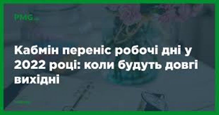З метою забезпечення раціонального використання робочого часу і створення сприятливих умов для святкування у 2022 році 8 березня — Міжнародного жіночого дня та 28 червня — Дня Конституції України рекомендувати керівникам підприємств, установ та організацій (крім органів Пенсійного фонду України, акціонерного товариства “Укрпошта”, Державної казначейської служби та банківських установ) для працівників, яким установлено п’ятиденний робочий тиждень із двома вихідними днями в суботу та неділю, перенести у 2022 році в порядку та на умовах, визначених законодавством, робочі дні з: